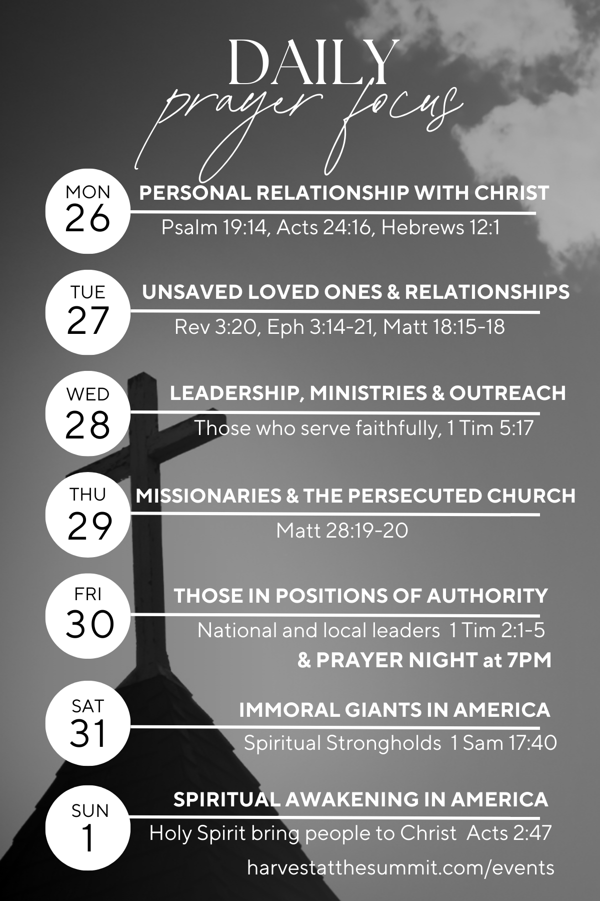 Join us at 7 PM at our Summit campus for a night of prayer.